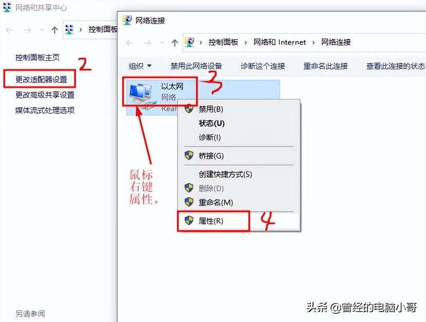 方法一:桌面上找到“网络”图标→右键鼠标点属性→更改适配器设置→以太网→右键鼠标点属性→双击IPv4或者IPv6即可查询IP地址