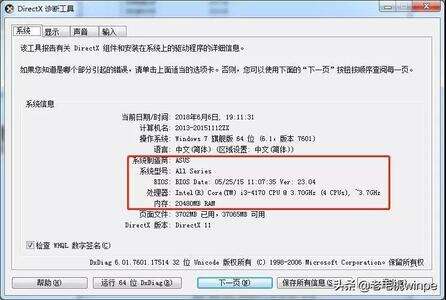 2、在打开的Direect诊断工具中,将选项卡切换至“系统”即可看到主板、CPU、内存等详细信息