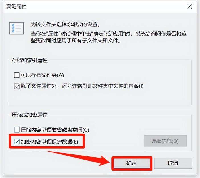 2、勾选“加密内容以便保护数据”,点击“确定”。