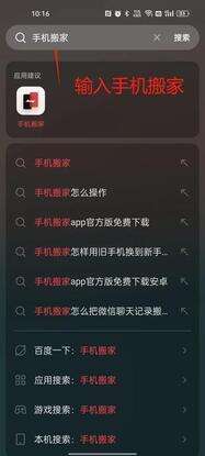 输入之后,下方会出现手机搬家APP图标,点击后稍作等待就会自动打开,随后选择“我是新手机”,OPPO、一加、realme等旧设备可以用同样的操作安装“手机搬家”软件直接迁移,其他品牌根据内部操作扫码下载对应软件即可完成迁移。