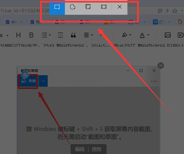 然后点击上图的“新建”按钮,就会在屏幕顶部显示几个按钮(如下图),第一个按钮是截取任意大小的矩形,第二个是按钮是截取任意形状,第三个按钮是截取活动窗口,第四个按钮是截取全屏。当然,我们也可以同时按下“win键+Shift+S键”,也能打开这几个按钮。