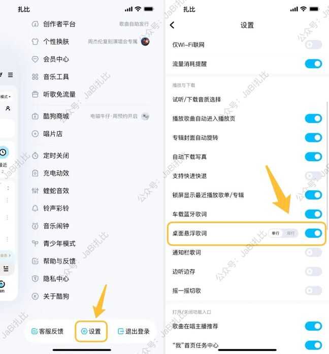 首先,需要把酷狗音乐升级到最新版。进入酷狗音乐进入「设置」页面,打开「桌面悬浮歌词」开关。这里可以设置「单行」或「双行」显示。