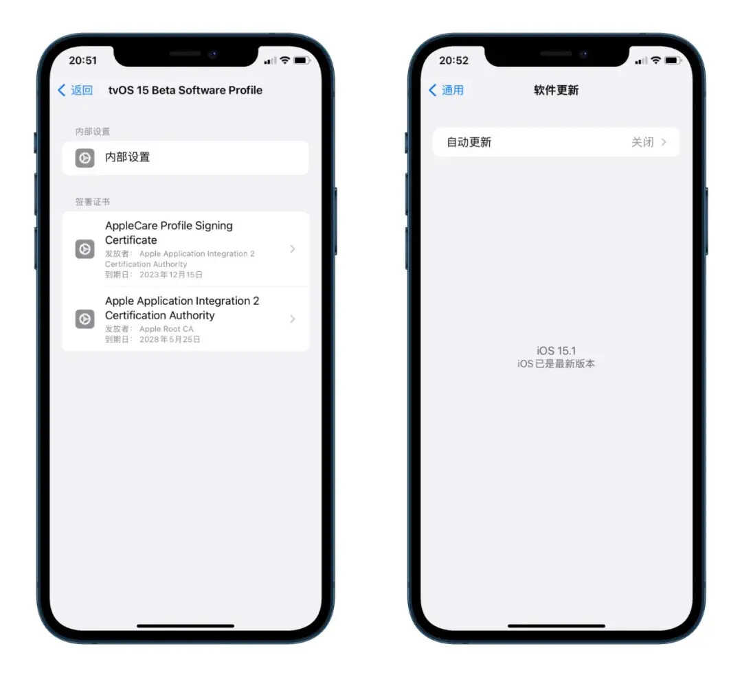 打开描述文件详细信息可以查看到有效期,打开关于本机即可显示为最新系统,不会收到任何更新推送信息。