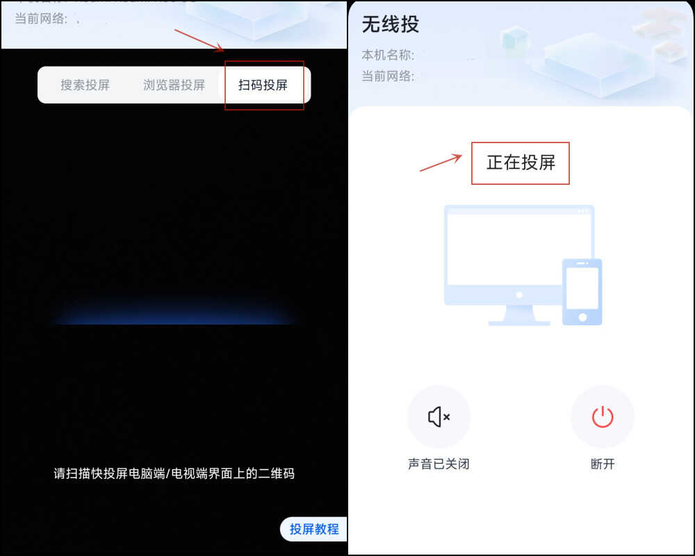 第三步:打开手机上的【快投屏】,现在我们就可以开始准备投屏了。在这里我们选择扫描电视上的二维码来完成投屏。所以在当前手机页面中选择扫码投屏。扫描电视上的二维码,现在电视上就出现手机的投屏画面了。