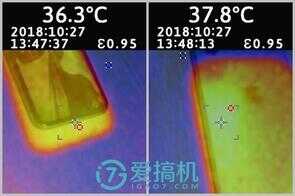 正面最高分出现在下巴中央,36.3度左右;背面最高分出现在苹果logo左下方(A12就在下面),为37.8度左右。