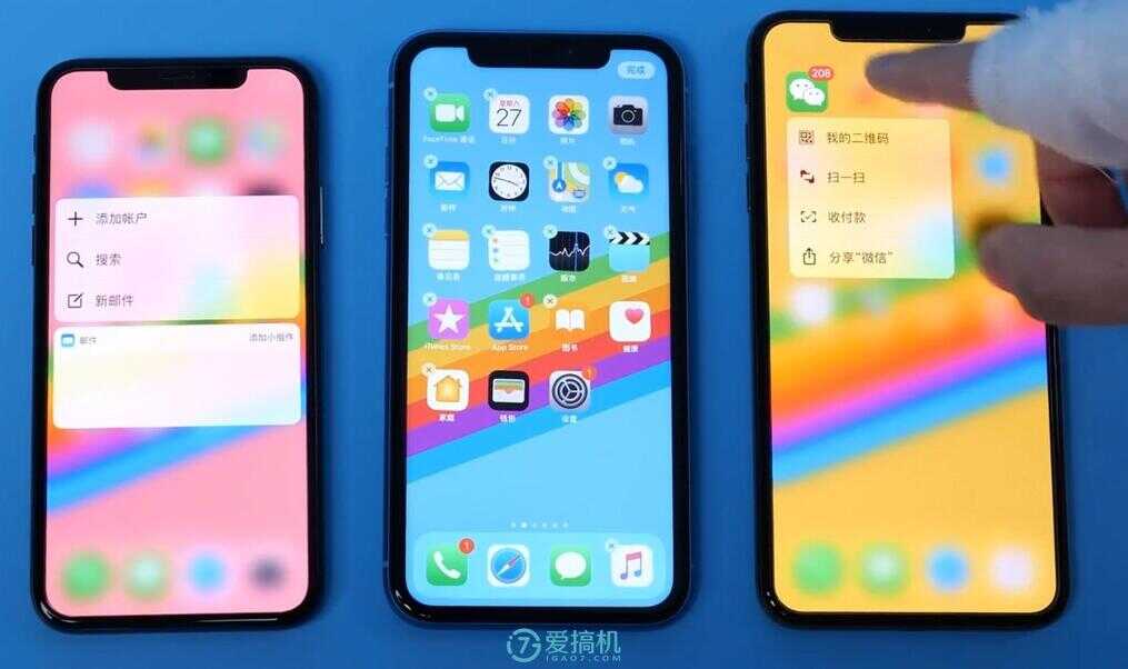 3D Touch:iPhone XR取消了3D Touch。在锁屏和控制中心的“用力按压”操作,都改成了“长按”。因为长按需要的响应时间更长,总会产生比iPhone X/XS系列慢一拍的错觉。虽然这几台刘海iPhone都没有侧边按压进入多任务的设定,但3D Touch在调出微信、支付宝二维码这些功能上还是挺有用的,在XR上就只能适应一下了。