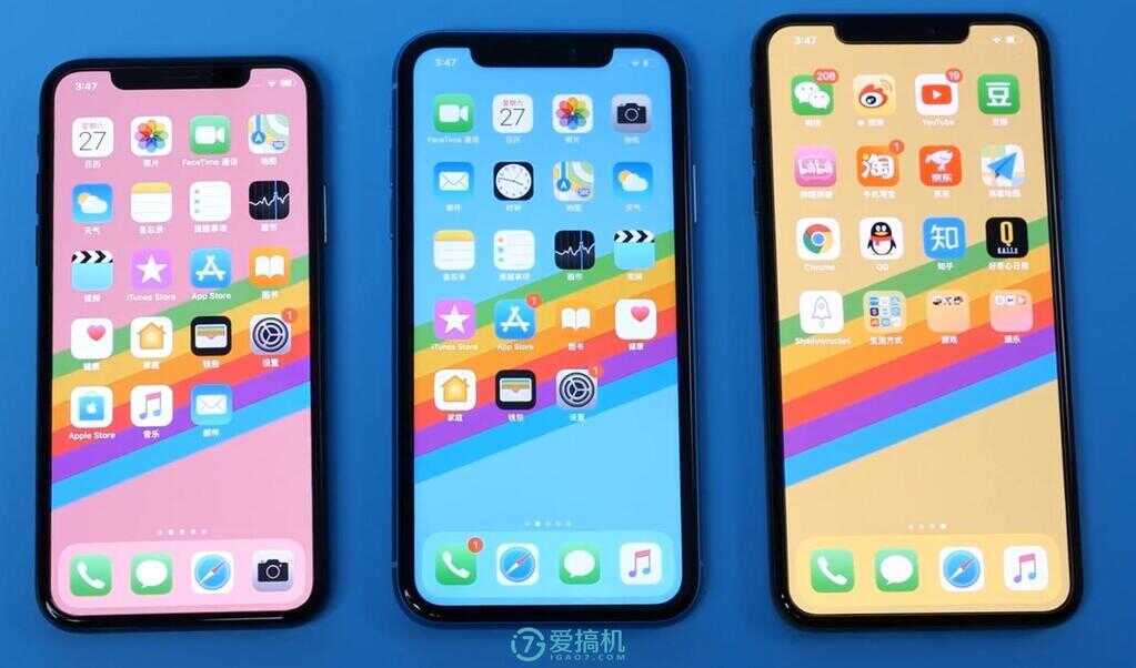 可视角度:下方图片中,屏幕最大的是XS Max、中间是XR、屏幕最小的是iPhone 8: