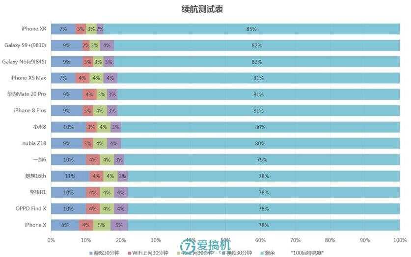 iPhone XR搭载2942mAh电池,现役iPhone中排名第二,仅次于XS Max。经过了30分钟狂野飙车8,各30分钟的wifi和4G上网和30分钟本地视频播放,共2个小时的续航测试后,剩余电量85%,无情地碾压了所有的旗舰,并和第二名拉开了一段距离。“高清屏”真的可以为所欲为,要知道Android阵营这边,还有4200mAh电池的选手的。