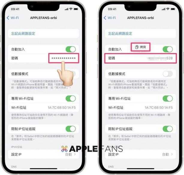 和前面的步骤相同,点击密码栏位,就可以显示或拷贝这个Wi-Fi 网络连线的密码。