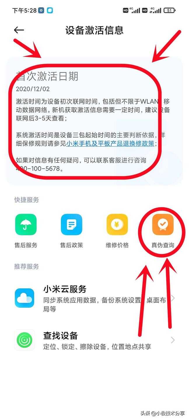 在这里我们可以一目了然地查看到这部手机的首次【激活日期】,如果说你的是新手机但是首次激活手机却是很久之前,那么可以断定这部手机就是使用过的手机或者不是正品手机,当然,除此之外点击【快捷服务】中的【真伪查询】也是可以快速查询知道的!