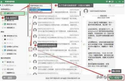 第三步:等待扫描完毕,点击左侧的【信息】栏,在中间选择需要恢复的信息,(红色部分为已经删除的信息),选择完成,点击右下角的‘恢复’。