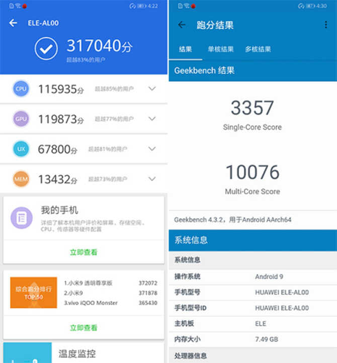 华为P30安兔兔(左)和Geekbench(右)跑分结果