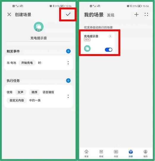 ⑤语音播报内容设置好后,系统自动跳回【创建场景】界面,在确认【触发事件】及【执行任务】设置无误后,点击右上角【√】,确认创建场景即可。