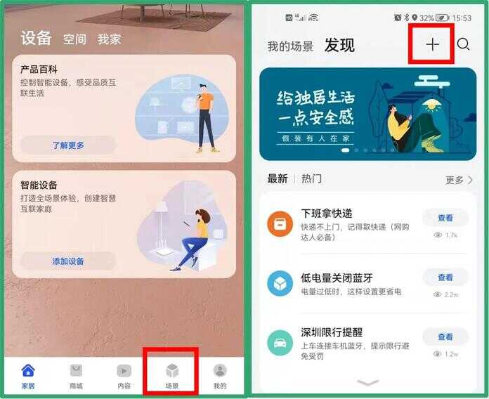 ① 打开华为手机【智慧生活】应用,点击进入【场景】界面,再点击右上角【+】;