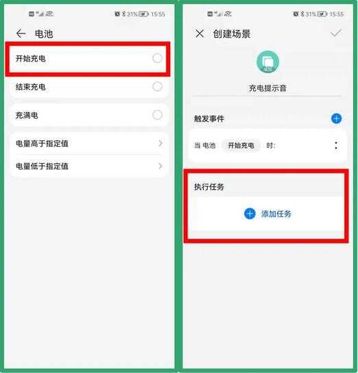 ③点击【开始充电】,进入创建场景界面,然后在【执行任务】处,点击进入【添加任务】;