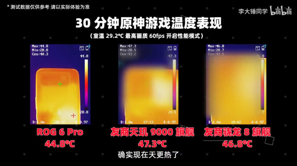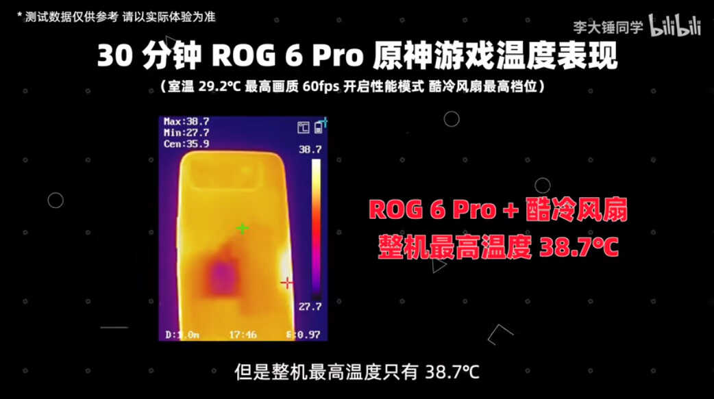 另外,ROG游戏手机6 Pro的温度控制十分出色,在30分钟《原神》后,它的最高温度为44.8℃,对比友商的天玑9000旗舰和骁龙8旗舰,确实更有优势。另外在配上了酷冷风扇6后,手机的温度直接降低至38.7℃,跟人体温度差不多,基本没有发热感。