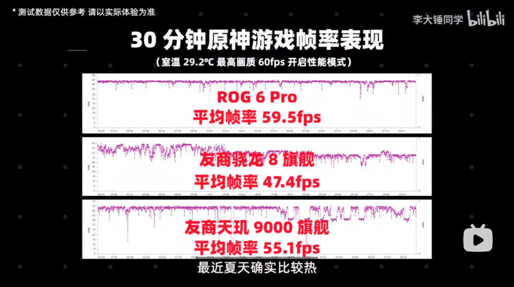 除了硬件全面升级以外,ROG游戏手机6系列的实际体验又有怎样的表现呢?目前不少数码大V都对这款新机进行了一番游戏测试,其中在@李大锤同学 的视频中,在令许多手机闻风丧胆的《原神》游戏测试上,ROG游戏手机6 Pro的帧率表现相当强,运行60fps原神30分钟,平均帧率为59.5fps,全程基本没有明显波动,芯片功耗也比骁龙8旗舰要好很多,流畅度得到了更大的提升。