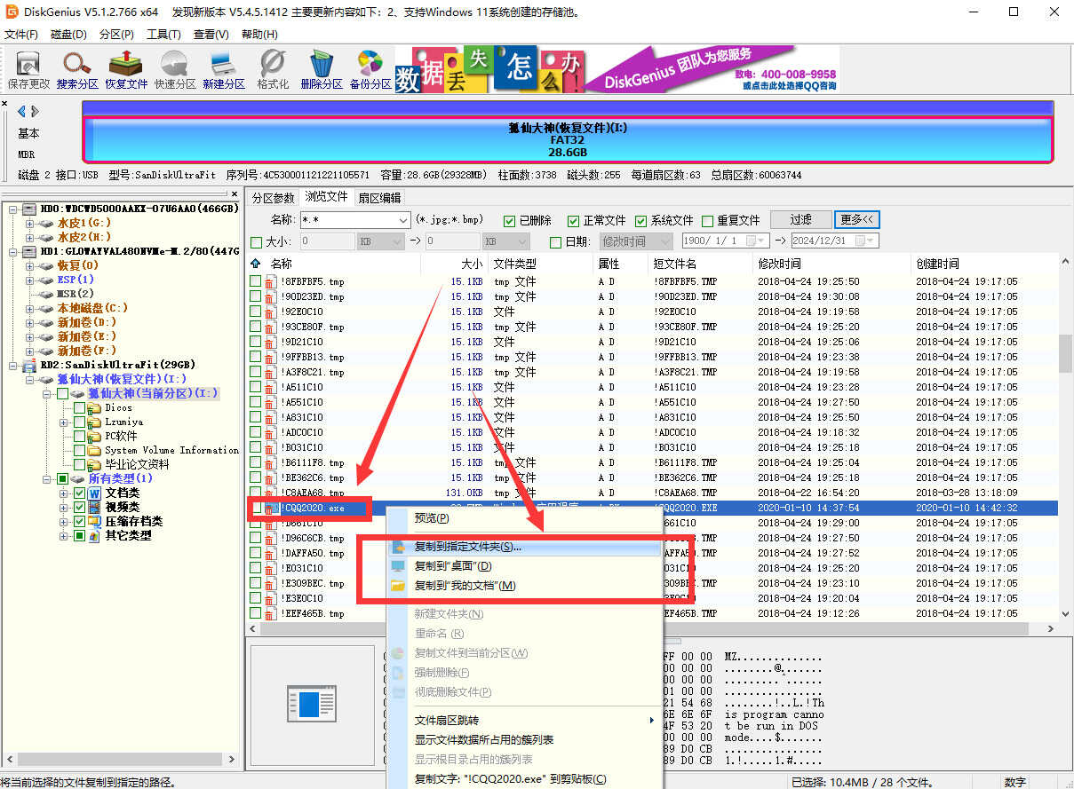 这个方法在扫描时花费时间会比较多,但是恢复的文件是很多完整的,如图找到exe后缀文件,恢复即可。