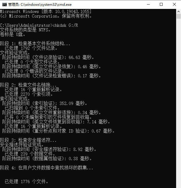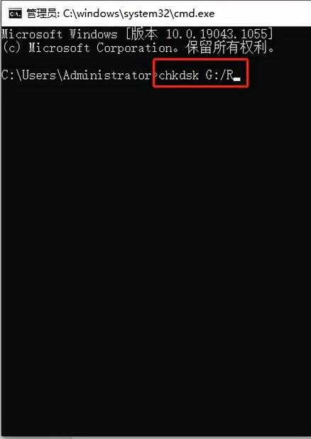 第二步:开启大招输入命令“chkdsk G:/R”回车执行,G是你的U盘盘符。