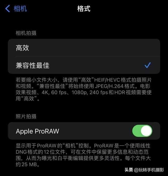 iPhone提供两种媒体存储格式,iPhone 12/13 Pro系列则多了一个Apple ProRAW。