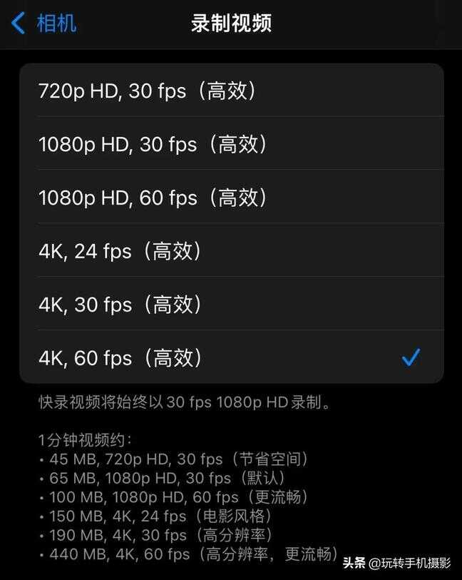 除了在相机设置当中选择视频规格,在录制视频界面轻点右上角可以在高清或 4K 录制与 24、30 或 60 fps 之间切换。关注玩转手机摄影,后续会结合一些实际案例教大家一些短视频的拍摄手法。
