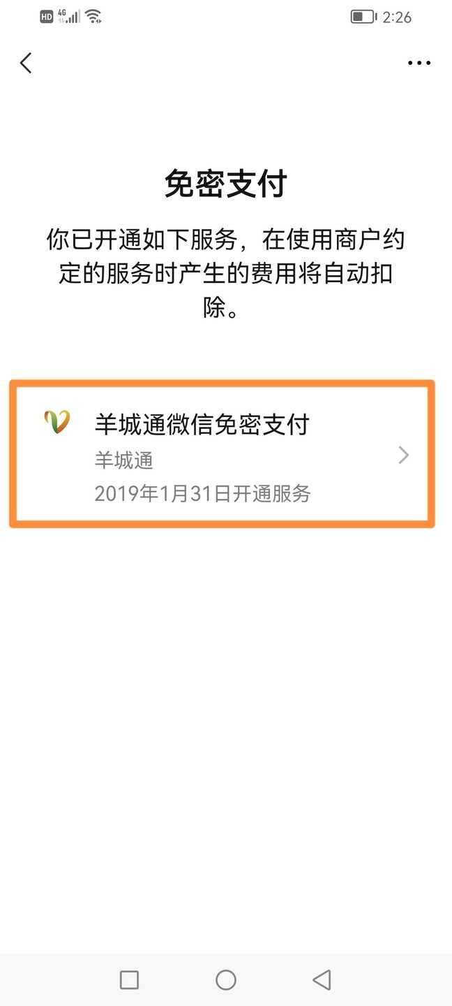 7 点击要取消免密支付的服务,这里为“羊城通微信免密支付”,在打开的界面中单击下方的“关闭扣费服务”按钮。