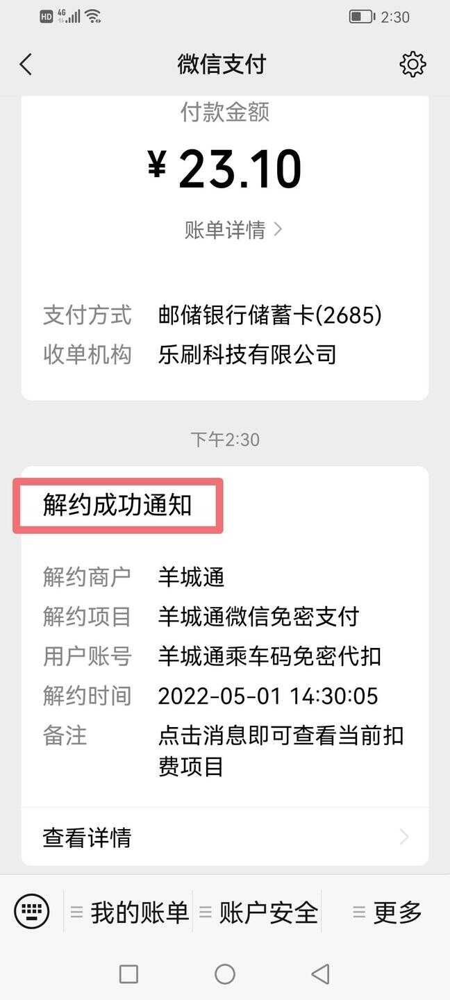 9 羊城通微信免密支付服务取消后,我们会收到微信支付发来的“解约成功通知”。