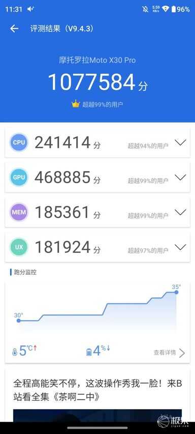 骁龙8+ Gen1的自身优势,再加上摩托罗拉的调教,moto X30 Pro性能释放还是相当猛。老规矩,安兔兔跑分来一波,1077584分的成绩凸显了它的强大实力。