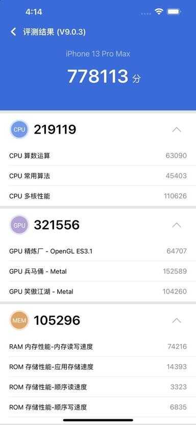在安兔兔(iOS版)的跑分测试中,iPhone 13 Pro Max取得了77.8万分的好成绩,轻松超越了此前的苹果旗舰机型得分;在3DMark的Wild Life测试中iPhone 13 Pro Max取得了9418分的成绩。仅从性能角度而言,iPhone 13 Pro Max所搭载的A15 仿生芯片性能表现完全可以满足各种场景下的性能需求,甚至可以在一定程度上能够满足生产力应用对于性能的需求。不过在拥有强大性能表现的同时,并不理想的散热配置将会和前代机型一样限制iPhone 13 Pro Max的性能持续释放表现。