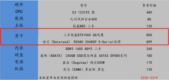 这套配置采用了E3 1231 V3搭配1060或者是580显卡,至于选哪一种小伙伴自己决定,如果想上全新N卡那么建议可以上1660,整套下来预算差不多在2K左右,性能和目前全新的3K以上配置不相上下,是预算不足又追求性能的最佳选择,就目前的游戏基本上无压力。