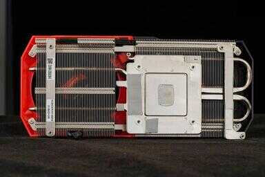 翻到背面,可以看到这张显卡背面采用简易喷漆的一体化金属背板,可以辅助散热并加固PCB板。