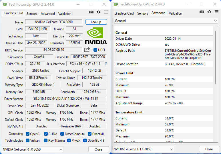 在开始测试前,我们先来介绍一下这张显卡的规格。七彩虹战斧RTX 3050 DUO显卡采用GA106-150核心,这是目前为止最为精简的安培核心,拥有2560个流处理器,配备8GB GDDR6显存,显卡基础频率为1552MHz,加速频率为1777MHz,TDP功耗为130W。