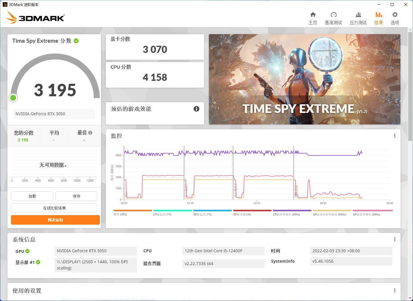 在3DMark Time Spy Extreme(4K渲染)测试中,RTX 3050战斧Duo图形分数达到了3070分,核心温度最高61℃,Hot Spot最高可达73度,GPU最高功耗127.5W,核心运行最高频率为1950MHz。