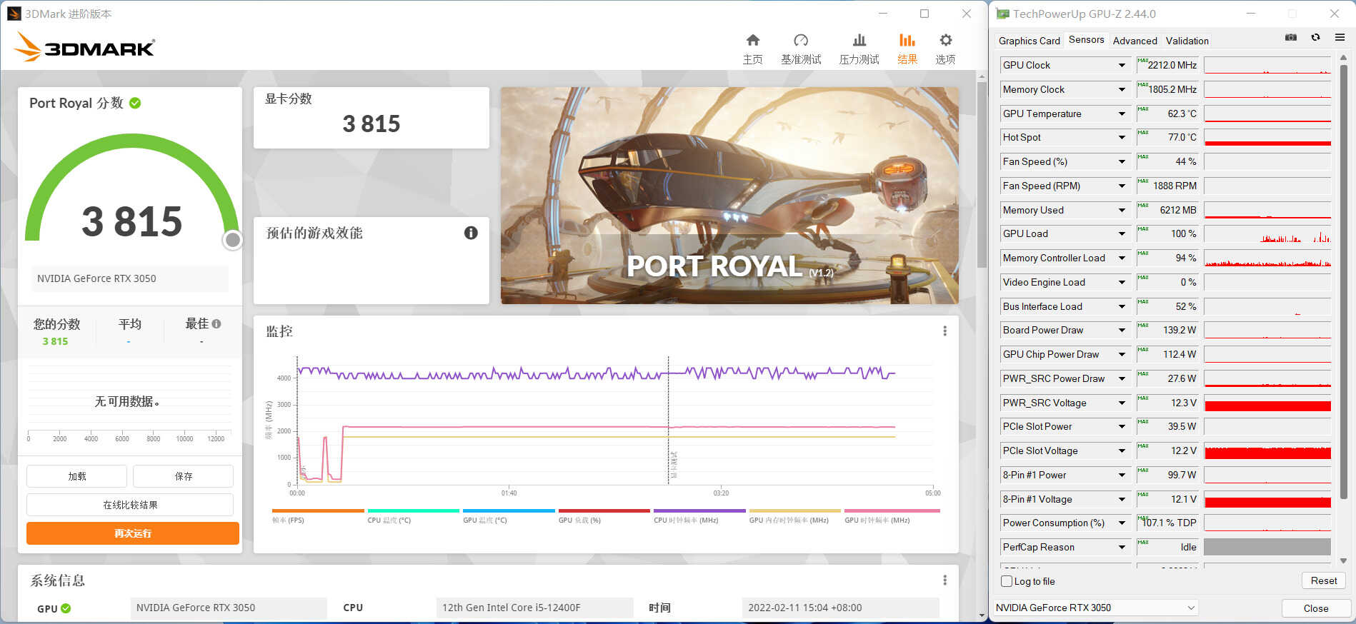 在3DMark FireStrike Ultra(4K渲染)测试中,七彩虹RTX 3050战斧的图形分数达到了3465分,核心温度最高59.3℃,Hot Spot最高可达71.9℃,核心运行最高频率为1957MHz,最高风扇转速1679RPM,GPU最高功耗127.5W。