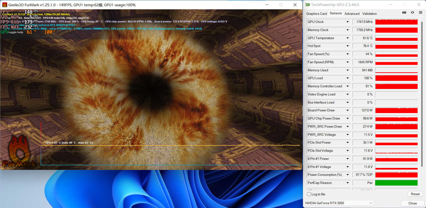 我们直接启动一键烤机,在运行30分钟以后,RTX 3050 的温度维持在61℃左右,显卡功耗维持在130W上下,满载风扇转速1845RPM,没有什么噪音。