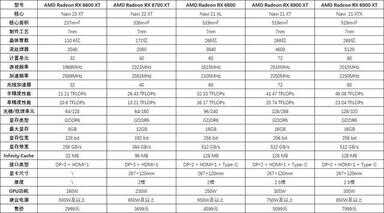 在测试前我们先来看看截止目前发布的RX 6000系显卡详细参数,方便大家对比查阅,笔者进行了简单汇总: