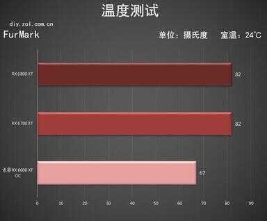 在温度测试方面,显卡均通过FurMark拷机软件进行拷机测试,其中讯景RX 6600 XT OC为67℃,但由于此次发布的显卡没有公版产品,所以该温度在表格中也不具备可比性,但是对于非公版的低功耗显卡来说,这个温度有些高。