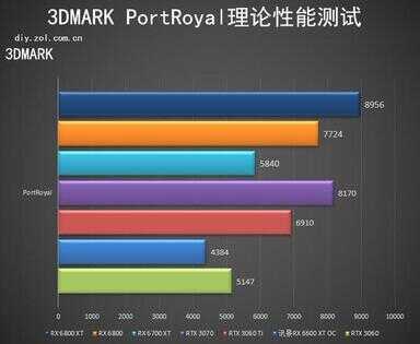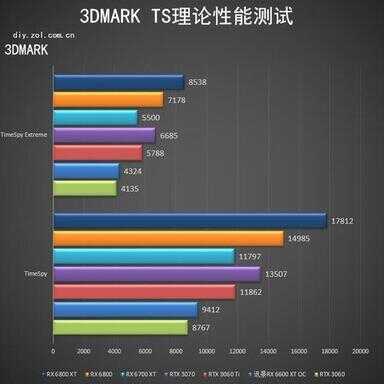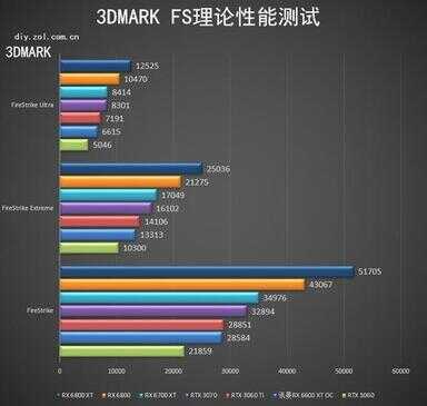 在针对显卡DX11环境的3DMARK FS套装测试中,我们测试了比较多的显卡,可以明显看到RTX 3060 Ti和RX 6600 XT分数咬得非常紧,但综合来看RTX 3060 Ti有小幅领先。而如果我们抛开NVIDIA显卡单看AMD来看,整体RX 6000系列的产品保持了非常明显的等差数列,层次划分较为鲜明。