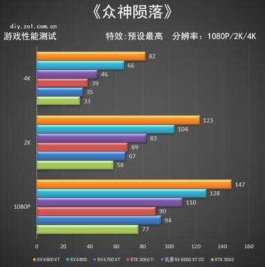 在《无主之地3》中,我们选择预设最高的恶棍画质,RX 6600 XT在2K和4K分辨率下依然被RTX 3060 Ti超过,但综合RX 6000系列来说,保持了比较统一的分数差距。