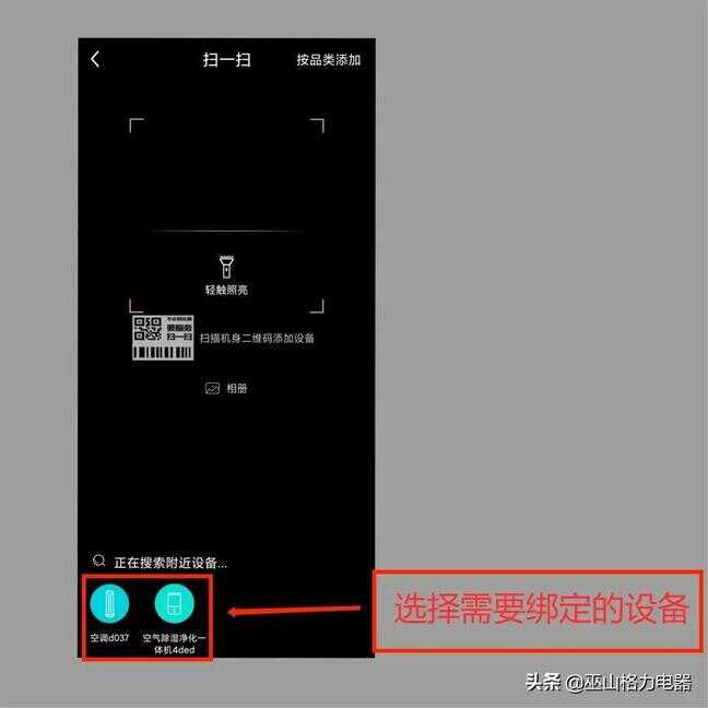 - 通过3种方式任意一种进行配网:搜索附近设备、扫描机身二维码或按品类添加设备