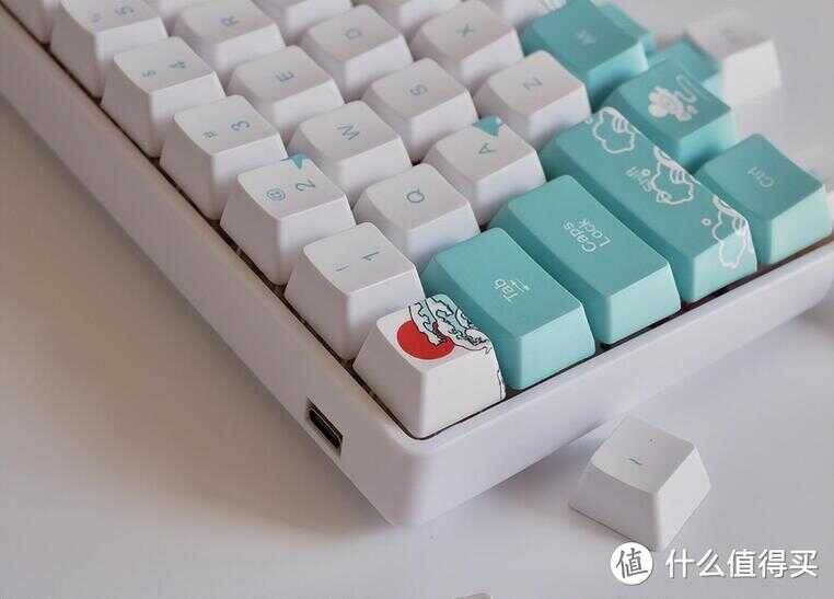 CMK是腹灵品牌冲击高端市场的系列,所以在用料以及配色设计上都是相当扎实。这款型号的键盘采用了68配列,有MX冰薄荷、水母段落、深海静音、拾光白轴可选。键盘的键帽采用了FSA高度的PBT材质双色球帽,手感出众不易打油。