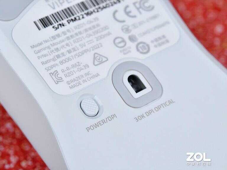 从外观方面来讲,雷蛇毒蝰V2专业版游戏鼠标的底部设计稍有变化。它去掉了2.4G无线接收器收纳槽和金属充电触点、电源开关和而DPI按键合二为一,我们可通过滚轮后方的指示灯颜色变化来判别鼠标的DPI档位。可以看出来是为了极致轻量化而作出的取舍。