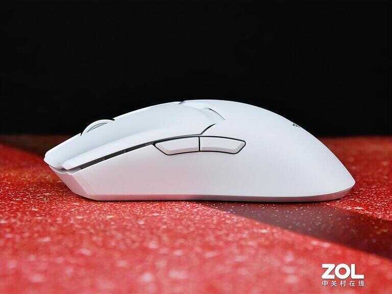 侧键部分,它的两枚侧键位置和大小都合理,且键程、软硬度以及手感一致度的表现也相当出色。以笔者右手型用户的使用习惯为例,这款鼠标的侧键可以轻松找到并按下,并且不容易误触,可以为游戏操作提供不错的体验提升。此外,这款鼠标的外壳采用磨砂质感,即使不使用防滑贴,它的防滑效果其实也很不错,贴上防滑贴后自然效果更好。对于后期维护来说,这种设计也更方便我们更换磨损的防滑贴配件,养护方面更加便捷。