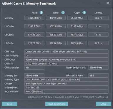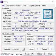 从AIDA64中可以看出酷睿i5-11320H更为详细的睿频信息,单双核最高睿频为4.5GHz、全核心睿频为4.3GHz,全核心睿频上限比酷睿i5-11300H的4.0GHz高了0.2GHz。