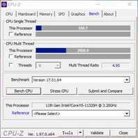 CPU-Z是常用的处理器测试软件,目前已更新至1.97版本。运行Version17测试的时间较短且负载较低,RedmiBookPro15增强版的酷睿i5-11320H能够跑满睿频,单线程分数为596.7,多线程分数为2950.9,均比酷睿i5-11300H略强,也与解锁45W功耗的酷睿i5-1165G7相差无几。