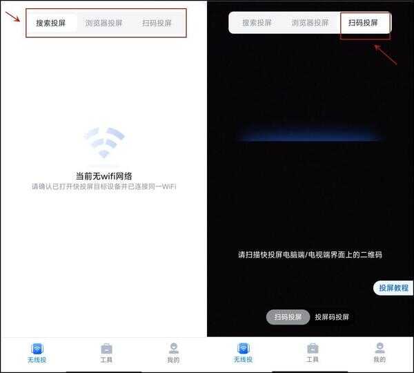 第三步:打开电视端的应用,找到投屏工具里的投屏二维码,拿手机扫码投屏的页面扫描电视上的二维码,即可完成投屏。