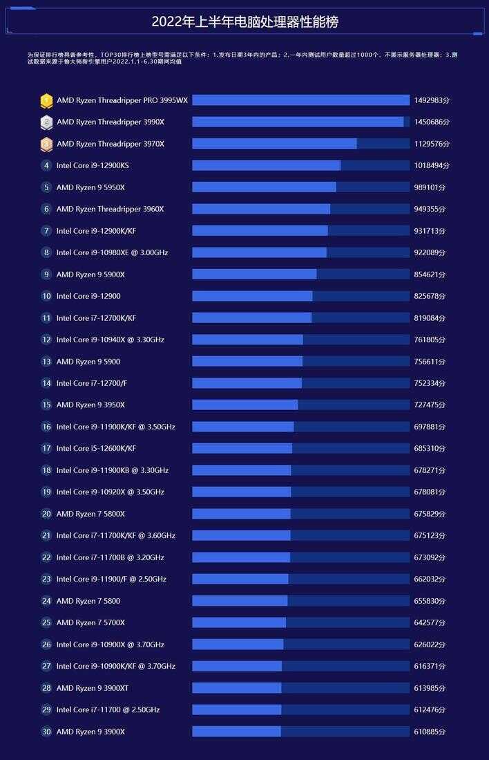 近日,鲁大师2022年半年报发布了PC硬件排行。排行数据包含2022.01.01—2022.06.30日鲁大师PC正式版测试数据。其中,PC处理器性能排行榜中,AMD依旧以王者姿势稳坐钓鱼台,任凭英特尔紧追不舍,依然拿下冠军。