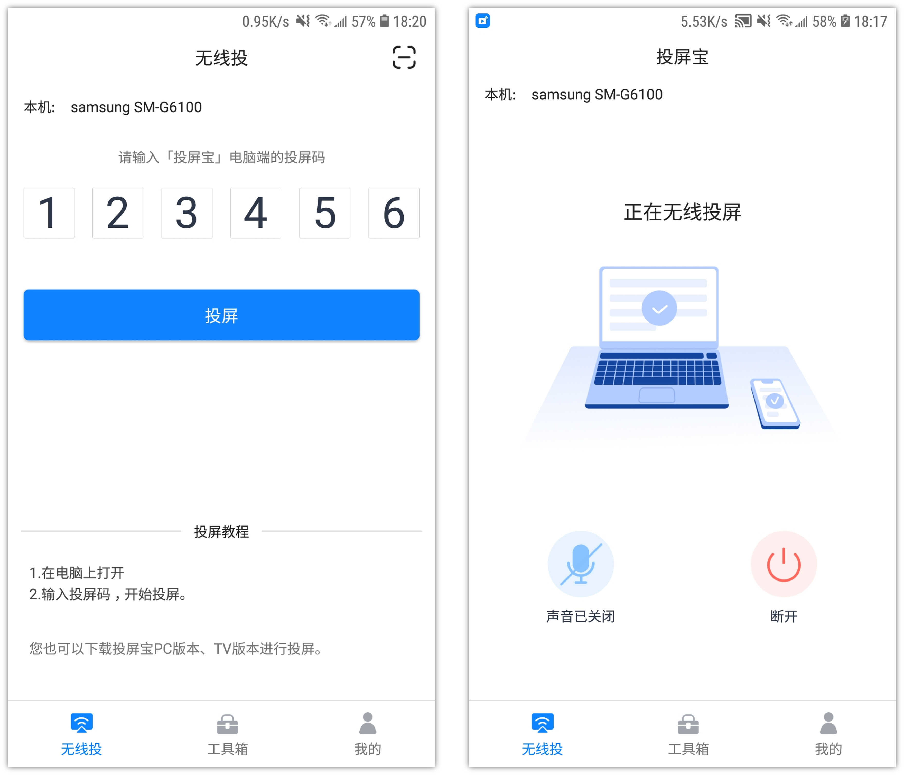 接着打开手机上的投屏宝,输入电脑上的投屏码,就可以连接设备进行投屏了,并且声音也能录制进去,非常流畅稳定。