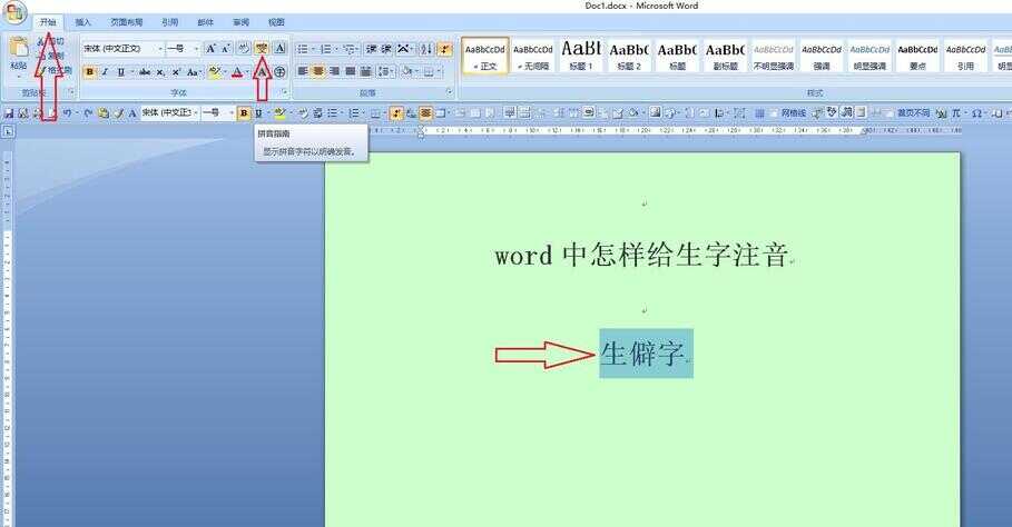 1.选中需要注音的生字词语,单击“开始”菜单,单击“拼音指南”命令,如下图: