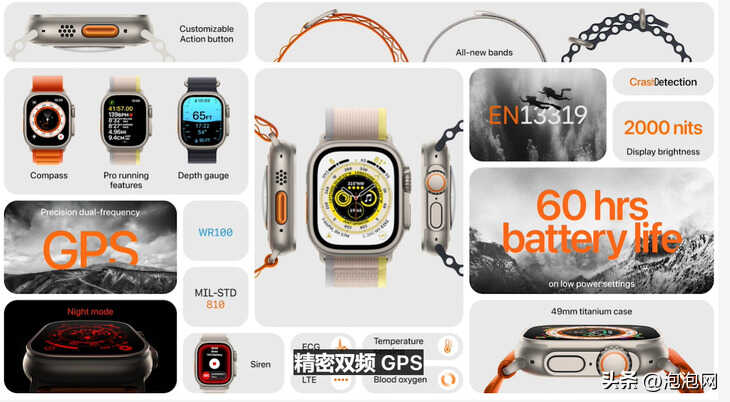 苹果官方表示,Apple Watch Ultra是一款适合户外涉险场景的多功能工具。它支持了L1+L5双频 GPS 定位;内置的深度计支持EN 13319认证,防水性能达到WR100,可以用于潜水环境。由于定位的原因, Apple Watch Ultra可实现36小时的常规续航,在此后发布的更新上更可达到60小时的极限续航。